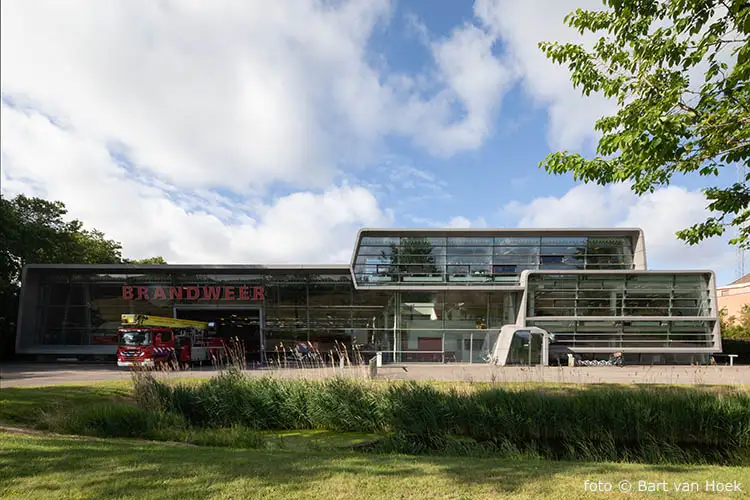 Aan de oostzijde bevindt zich de garage met brandweerwagens. Daarnaast zijn er kantoorruimten rond een vide. Een vleugel aan de zuidwestzijde biedt ruimte aan woonverblijven voor de medewerkers.