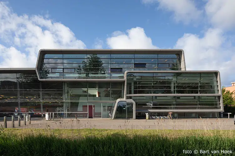 De glazen gevel is voorzien van een lichtkunstwerk van Marten Winters.