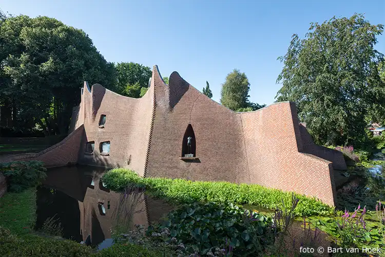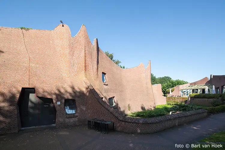 De grillig gevormde gebouwen hebben achterover hellende gevels van baksteen. Het langwerpige museumgebouw heeft op de kop een podium voor het buitentheater. Aan de noord- en oostzijde ligt een vijver om het gebouw dat lager ligt dan het straatniveau. Het horecapaviljoen met serre ligt aan de noordkant van het terrein en kijkt uit op het museum.