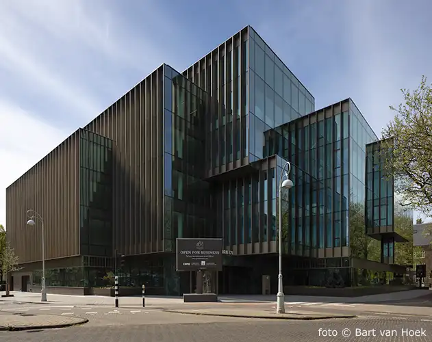 Kenmerkend voor het 5 verdiepingen tellende pand zijn de in elkaar geschoven rechthoekige volumes en gevels met veel glas en donkere verticale lamellen.
