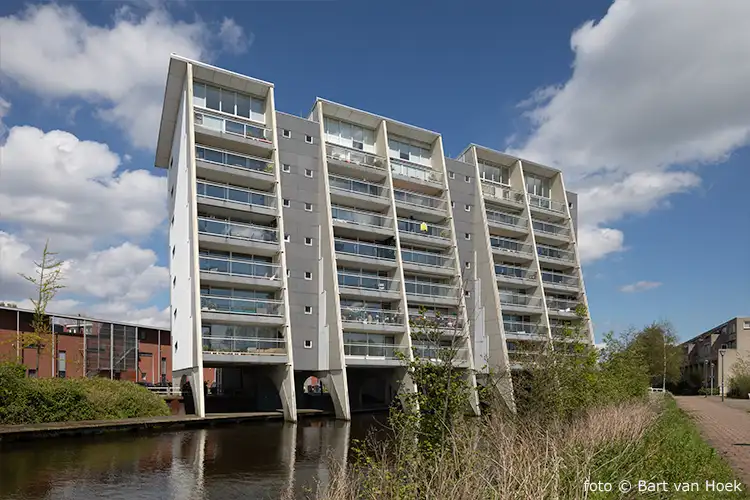 Het gebouw met 35 koopwoningen steekt uit boven de omliggende buurt met strookvormige laagbouw die is ontworpen door architecten als Arne van Herk, Erna van Sambeek en Bé van Aalderen.
