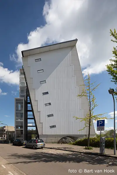 In dit 7 verdiepingen tellende appartementengebouw regeert de schuine lijn. Het schuine gebouw staat schuin in de Charta 77-Vaart.
