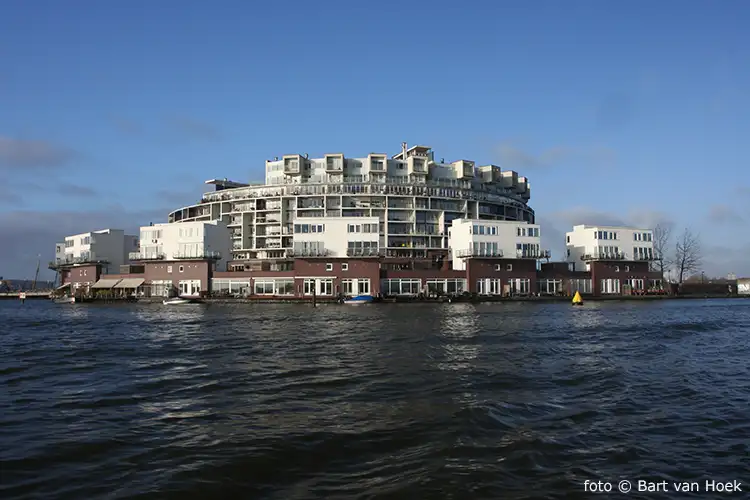 Het cirkelvormige gebouw van 7 tot 9 verdiepingen omvat 242 appartementen, waaronder 18 penthouses, die herkenbaar zijn als aparte volumes op het dak. Als onderdeel van het plan zijn aan de kade watervilla's gerealiseerd.