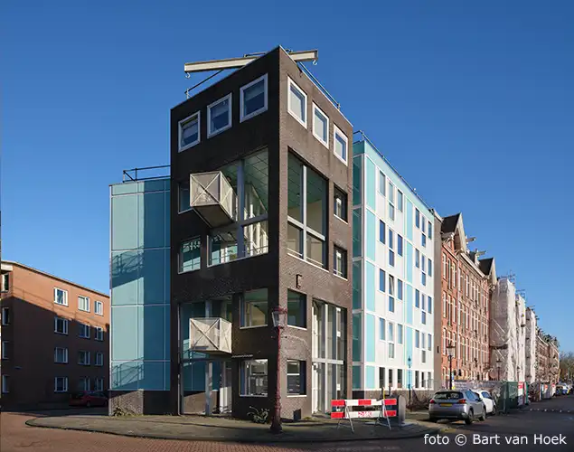 Op de scherpe hoek van de Jacob Catskade met Kattensloot en de De Wittenstraat is dit woongebouw met HAT-eenheden, woningen voor singles, gebouwd. Het gebouw volgt de richtingen van de straten. Op deze hoek ontmoeten de 2 richtingen elkaar, een uit bruin bakstenen gevel met gaten geplaatst in de richting van de Catskade omhuld het bouwvolume dat de richting van De Wittenstraat volgt. Binnenin bevindt zich een trappenhuis. Aan De Wittenstraat loopt het gebouw getrapt van 5 naar 2 lagen.
