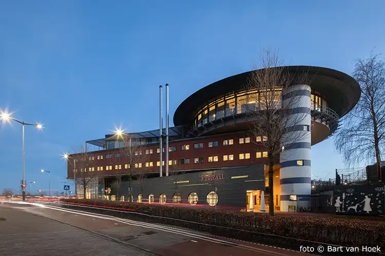 In dit gebouw ten noordwesten van Amsterdam Centraal zijn de verkeersleiding en technische dienst van Prorail ondergebracht.