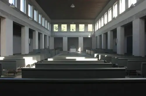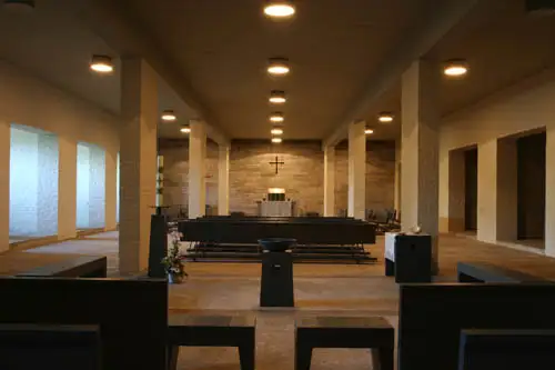 De bovenkerk en crypte zijn via een patio, het atrium genaamd, verbonden met de noordwesthoek van het bestaande complex van Dominicus Böhm en Martin Weber uit 1922 - 1923. Deze twee Duitse architecten hadden ook een kerk voor het klooster ontworpen, maar die is nooit gerealiseerd. Het atrium is te bereiken via het entreegebouw, waar ook de spreekkamers zijn te vinden. Dit gedeelte is in de jaren 1956 - 1968 gerealiseerd.