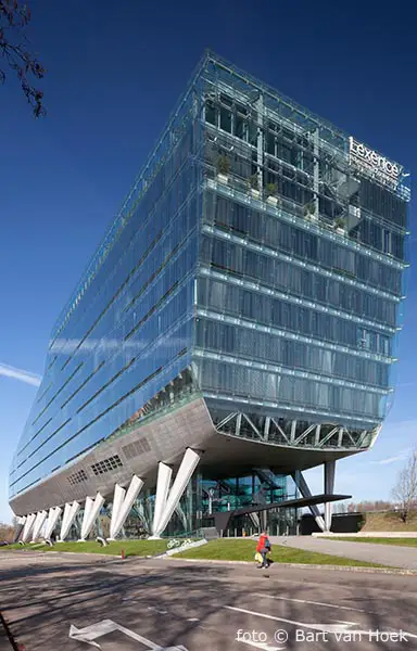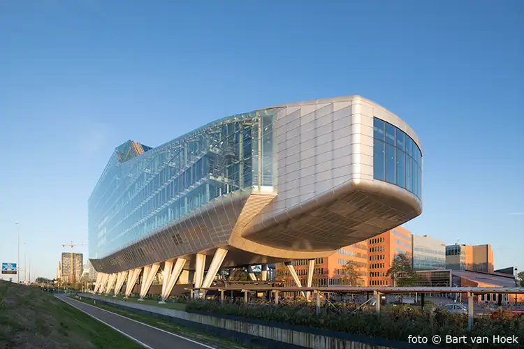 Voor het gebouw is veel gebruik gemaakt van staal, glas en aluminium. De vorm van de enkel- en dubbelgekromde geanodiseerde aluminium elementen aan de onderzijde van "de schoen" zijn gemodelleerd met het computerprogramma Catia, een programma dat onder meer in de Formule 1 en bij de realisatie van de ontwerpen van de Californische architect Frank Owen Gehry wordt gebruikt. De bouwkosten zijn niet bekend gemaakt, maar dit is waarschijnlijk het duurste Nederlandse kantoorgebouw per vierkante meter vloeroppervlak. De bouwkosten worden geschat op 100 miljoen euro.