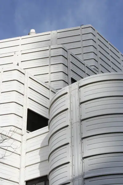 Kenmerkend voor het gebouw zijn de afgeronde hoeken, terugspringende gevelvlakken en een star maatraster. Voor de opvallende gevel zijn zo'n 5.200 witte aluminium platen gebruikt. De begane grond heeft een metselwerk gevel. Ook het binnenspouwblad is uitgevoerd als metselwerk.