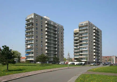 De langsgevels van de torens zijn uitgevoerd in baksteen. De kopgevels hebben glazen puien met balkons.