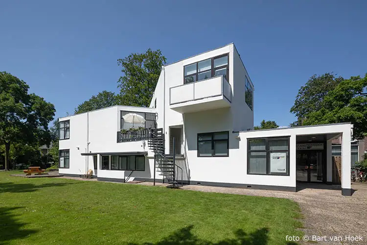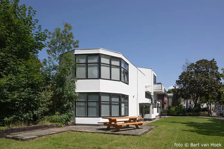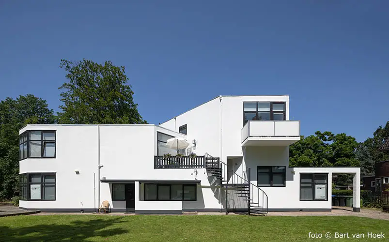 De bakstenen buitenwanden zijn wit gepleisterd. De oorspronkelijk stalen kozijnen zijn vervangen door aluminium. Beide woningen hebben een balkon.