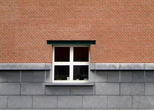 Het project is uitgevoerd in rode baksteen boven een plint van grijze natuursteen. De lateien zijn uitgevoerd in groen geschilderd staalprofielen.