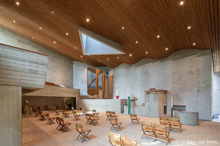 Links van de entree bevindt zich een theaterzaal. Rechts is een strook met ondersteunende functies gerealiseerd. Het interieur van de kerkzaal zelf is een van de weinige brutalistische interieurs in Nederland. Veel elementen zijn van in het werk gestort beton. De kerkruimte loopt op in hoogte, van 4 meter hoogte aan de achterzijde tot 14 meter bij de klokkentoren. Het golvende plafond met driehoekig daglicht is van houten latten.