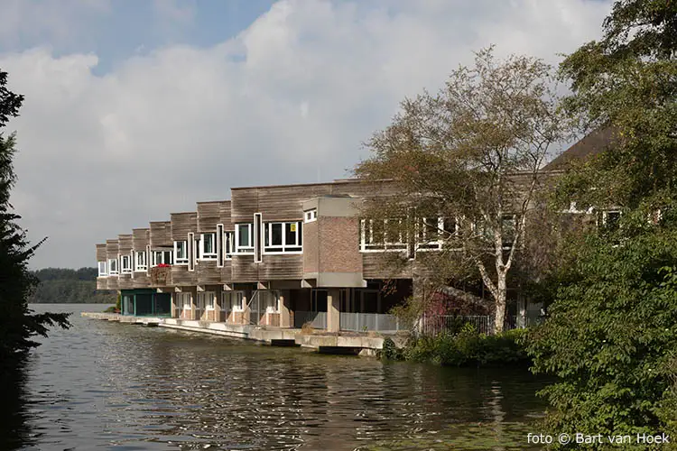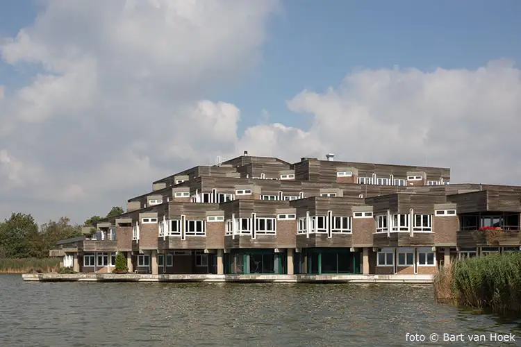Het gerealiseerde gebouw heeft een structuralistische opzet op een stramien van 8 bij 8 meter en een hoekverdraaiing van 45 graden. De betonnen structuur is ingevuld met baksteen, houten geveldelen en glazen puien. Het gebouw heeft een getrapte opbouw die oploopt naar landzijde.