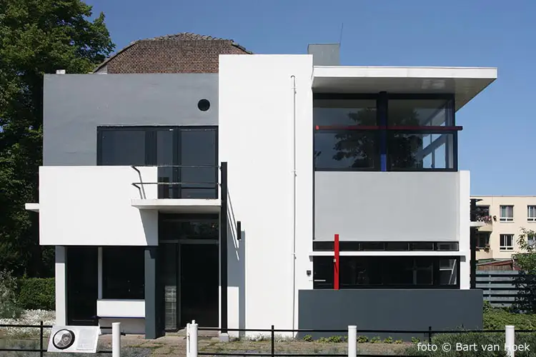 De ontwerpen bestaan uit een orthogonale ruimtelijke composities van vlakken en balken. Dit wordt ook wel neo-plasticisme genoemd. Er wordt gestreefd naar dematerialisering, dat wil zeggen dat de textuur van de materialen niet herkenbaar mag zijn. Het kleurgebruik bestaat uit de primaire kleuren rood, blauw en geel en zwart, grijs en wit. Doelmatigheid staat centraal, monumentaliteit is niet van belang. Er worden kubistische gebouwen met platte daken gerealiseerd.